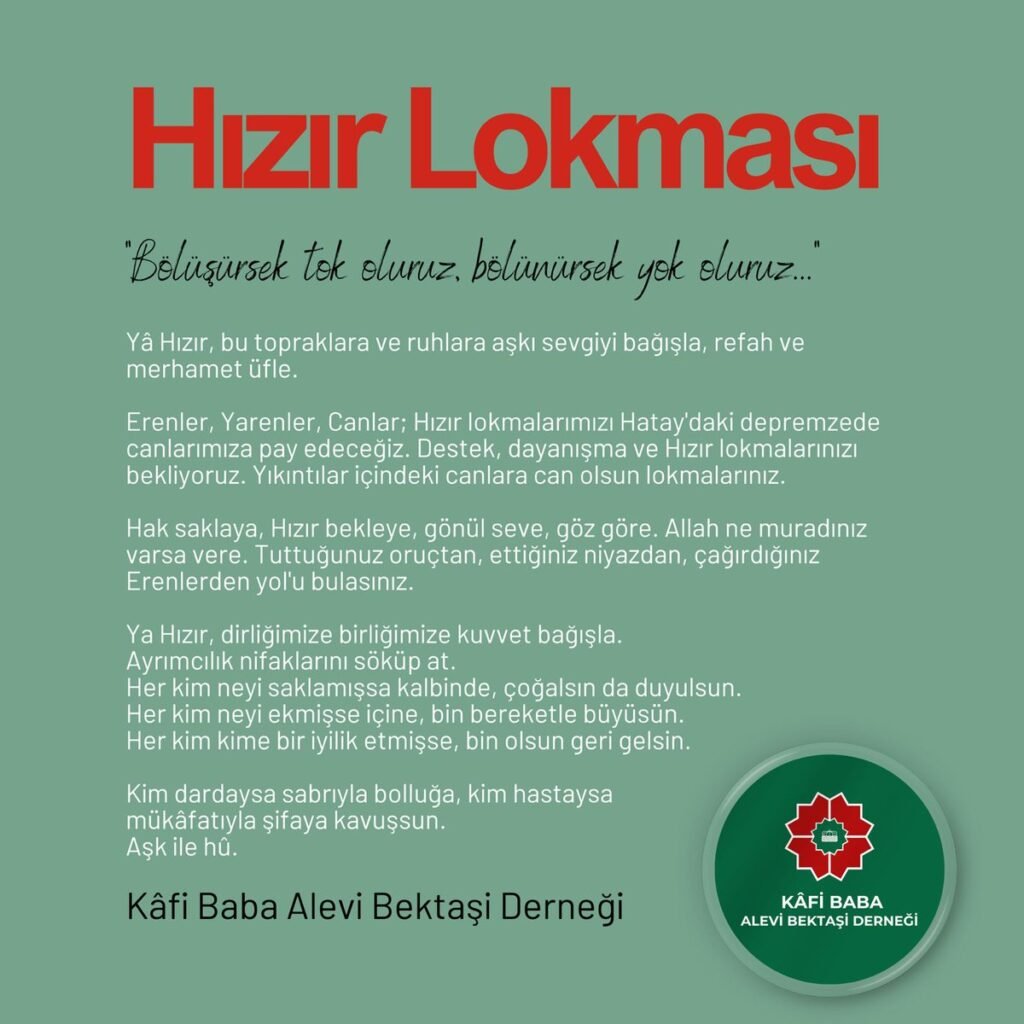 Kâfi Baba Alevi Bektaşi Derneği, Hızır Orucu vesilesiyle hazırlanan lokmaların Hatay’daki depremzedelerle paylaşılacağını duyurarak birlik ve beraberlik çağrısında bulundu.