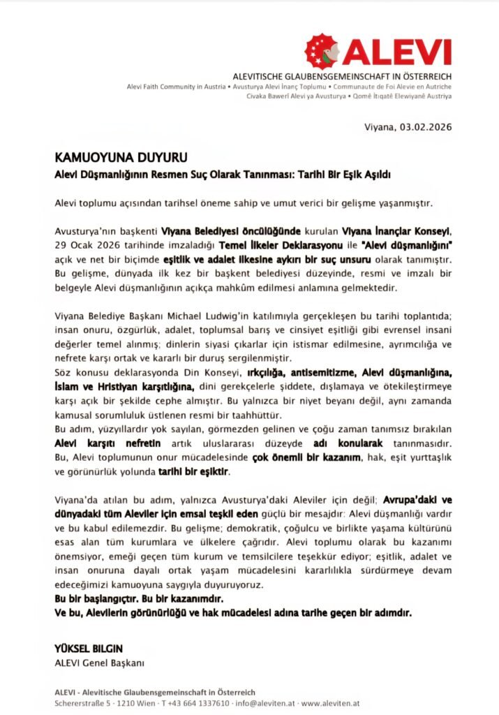 Alevi toplumu için önemli bir kazanım olarak değerlendirilen gelişme, Avusturya’nın başkenti Viyana’da yaşandı. Viyana İnançlar Konseyi, 29 Ocak 2026 tarihinde imzaladığı “Temel İlkeler Deklarasyonu” ile “Alevi düşmanlığı”nı açıkça eşitlik ve adalet ilkelerine aykırı bir suç unsuru olarak tanımladı.